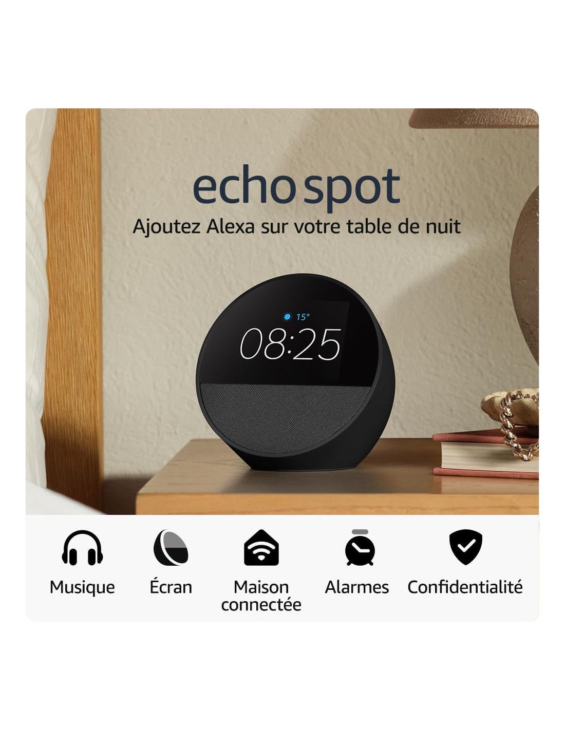 ez Amazon Echo & AlexaECHO SPOT : un réveil connecté élégant avec un son de qualité et Alexa, pour vous réveiller, vous relaxer et bien plus encore. RÉVEIL CONNECTÉ PERSONNALISABLE : consultez l'heure, la météo et le titre des chansons d'un simple coup d'œil, contrôlez vos appareils connectés compatibles, et bien plus encore. Personnalisez votre écran en sélectionnant le style de cadran et thème couleur de votre choix. SON PUISSANT IMPOSANT : profitez d'un son riche, de basses profondes et de voix claires. Demandez simplement à Alexa de lire de la musique, des podcasts et des livres audio de vos fournisseurs de service préférés (Amazon Music, Apple Music, Spotify, etc.). Co